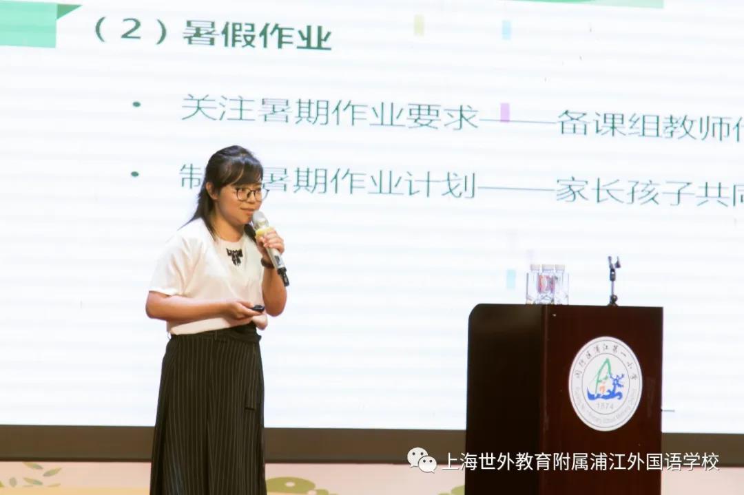 学校副校长孙颂欢老师首先从学校概况、办学理念、办学目标、办学特色、育人目标、师资队伍等方面向家长进行了详尽的介绍。上海世外教育附属浦江外国语学校是一所由闵行区教育局、浦江镇政府、漕河泾开发区浦江高科技园与上海世外教育集团合作开办的九年一贯制公办学校,旨在完善浦江高科技园区的基础教育配套设施,推动浦江镇教育学区化、集团化建设。学校致力于建设成为一所世外标准、一流品质、国际融合、特色鲜明的优质学校,秉持“融会贯通,和谐致美”的办学理念,践行“芬雅浦江,星耀中华”的办学目标,志在培育具有“中国心、世界眼、未来脑、创新手、时代行”的追梦人。
