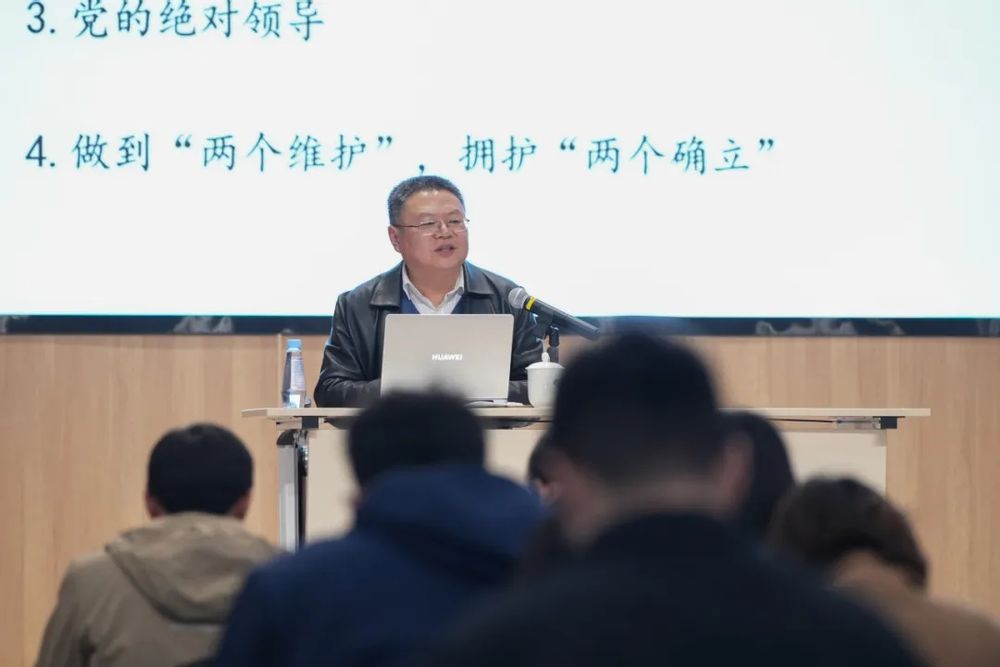 在谈到新时代“坚持党的领导”的新要求时,杨教授强调了党的全面领导、党中央集中统一领导、党的绝对领导的重要性,并指出要以实际行动坚定拥护“两个确立”、坚决做到“两个维护”。